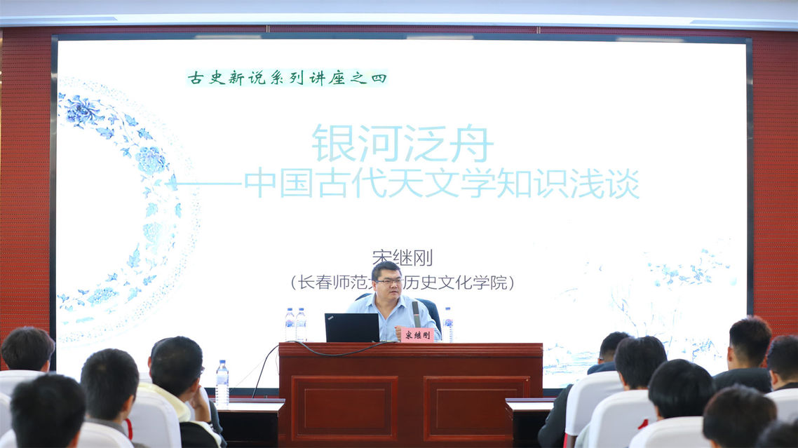 本次讲座是思想政治理论教研部主办的“人文素质大讲堂”系列活动之一,特邀长春师范大学历史文化学院副教授宋继刚主讲。宋继刚副教授以深厚的学术功底与生动的讲解风格,为师生们带来一场兼具知识性与趣味性的文化盛宴。讲座开篇,他以中国航天工程发展成果为导引,巧妙衔接古今航天探索脉络,进而层层铺陈展开。从《大辞海》对天文学的定义切入,结合《山海经》《周易》等史料与汉朝四神瓦当、苏州天文图等文物,系统梳理了中国古代天文学“重观测”的特点;借《博物志》“乘槎至天河”典故与“迢迢牵牛星”诗句,串联起古人对银河的浪漫想象;通过“夏后启飞天”“嫦娥奔月”等传说,展现中华民族自古以来对宇宙探索的执着追求,让抽象的天文知识变得鲜活可感。