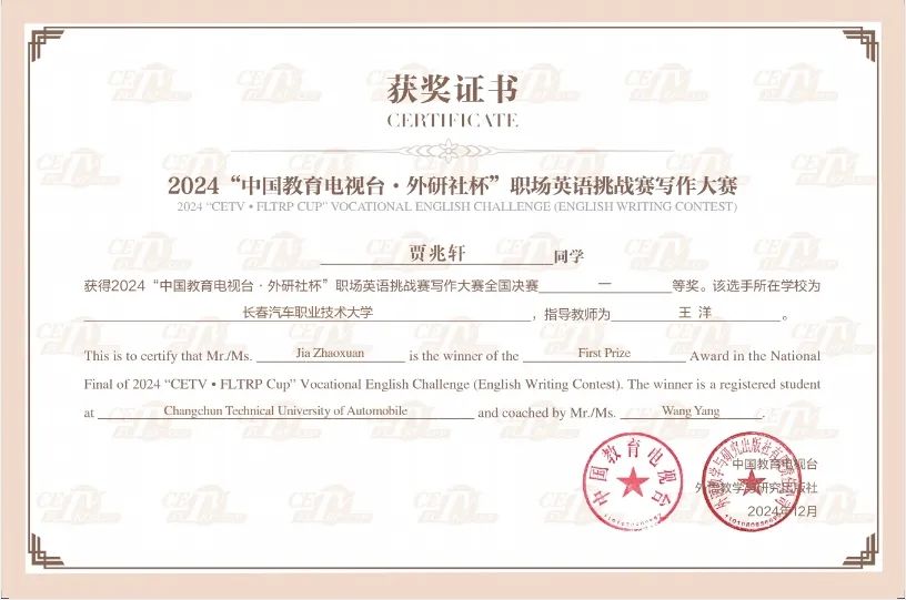 近日,“中国教育电视台·外研社杯”职场英语挑战赛写作大赛全国决赛圆满落幕。本次大赛汇聚了来自全国 28 个省、市、自治区的90名精英选手,经过激烈角逐,我校学生贾兆轩在王洋老师的精心指导下,荣获全国一等奖。获奖证书王洋老师指导贾兆轩写作贾兆轩参加全国线上比赛据悉,“中国教育电视台·外研社杯”职场英语挑战赛由中国职业技术教育学会提供专业指导,中国教育电视台与外语教学与研究出版社联合主办。该写作大赛旨在全面考查学生的英文表达功底、逻辑分析能力、职场沟通技巧以及人文素养情怀,为学生的未来职业发展与个人成长强势赋能。一直以来,我校秉持赛教融合的教学理念,积极推动职业英语写作教学的创新与改革,培养适应时代需求的高素质技术技能人才。未来,我校将继续坚持把赛事标准与教学实践紧密结合,为社会培养更多“会语言、通国家、精领域”的综合性人才,为职业教育高质量发展贡献力量。撰稿:公共教学部 王洋 审编:党委宣传统战部