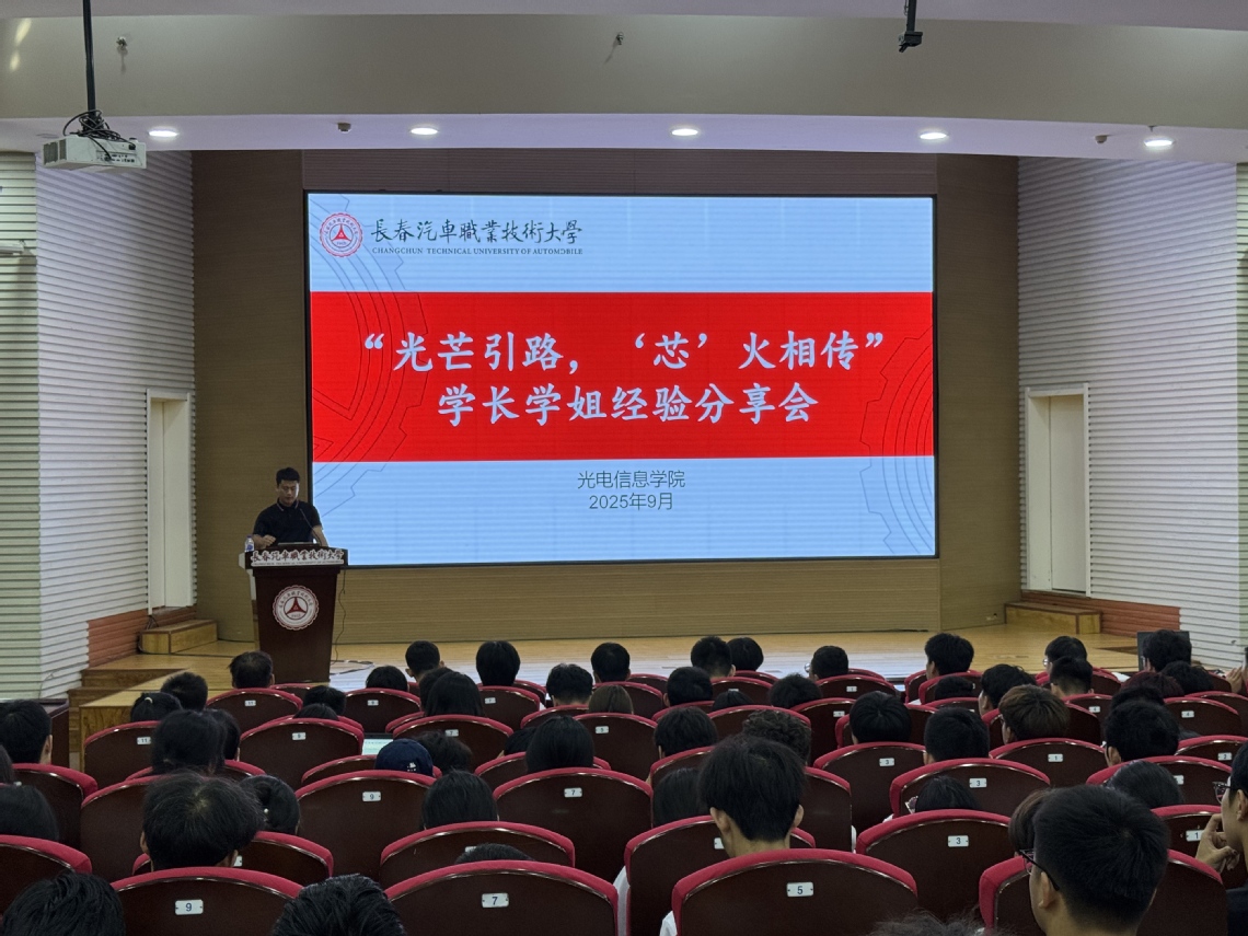 为助力2025级新生快速适应大学生活、明晰学业发展方向,9月10日,光电信息学院以“光芒引路,‘芯’火相传”为主题举办学长学姐经验分享会。2021级毕业生王立博(现就职于一汽研发总院)、2023级学生马麟程与杨玥浛、2024级学生曹佳四位优秀学生代表受邀分享。学长学姐们围绕新生关切的就业规划、班级服务、实践成长、学习适应等核心议题,提供兼具实用性与指导性的成长建议。分享会伊始,王立博结合自身职场经历,从企业人才需求导向、职业心态调整、简历撰写技巧及面试应对策略等方面,系统梳理大学生就业规划的关键节点,用行业视角阐释大学学习与职场能力的衔接逻辑,帮助新生建立“以就业为目标、以能力为核心”的学习认知。随后,马麟程聚焦“学生干部如何高效服务班级”展开分享。他倡导“共学习、同进步”的相处模式,强调学生干部不是管理者,而是与同学并肩前行的同行人,希望同学们能在服务他人中实现自我成长,营造有凝聚力的班级氛围。杨玥浛以“主动尝试,开启大学无限可能”为核心,结合自身学生会工作、参与技能大赛的经历,分享“从零基础报名竞赛到获得省级奖项”“从新手干事到统筹学院活动”的故事,鼓励新生打破“怕出错、怕失败”的